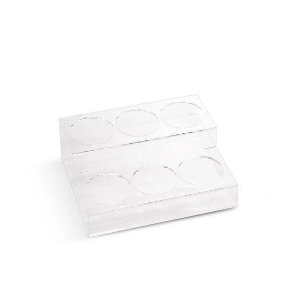 Our syrup holder is designed to fit on a counter and holds 6 bottles. It keeps your syrups organized and your counters clear of clutter. It’s made of acrylic and keeps bottles from tipping if you use it to store bottles with pumps.