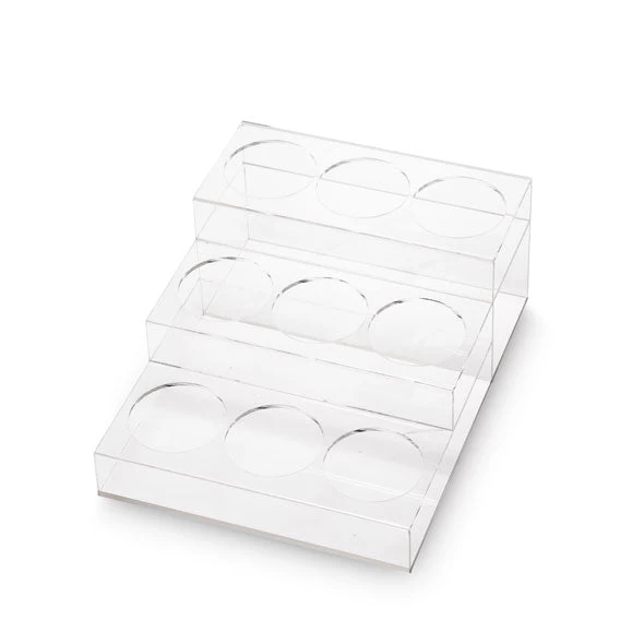 Our syrup holder is designed to fit on a counter and holds 9 bottles. It keeps your syrups organized and your counters clear of clutter. It’s made of acrylic and keeps bottles from tipping if you use it to store bottles with pumps.