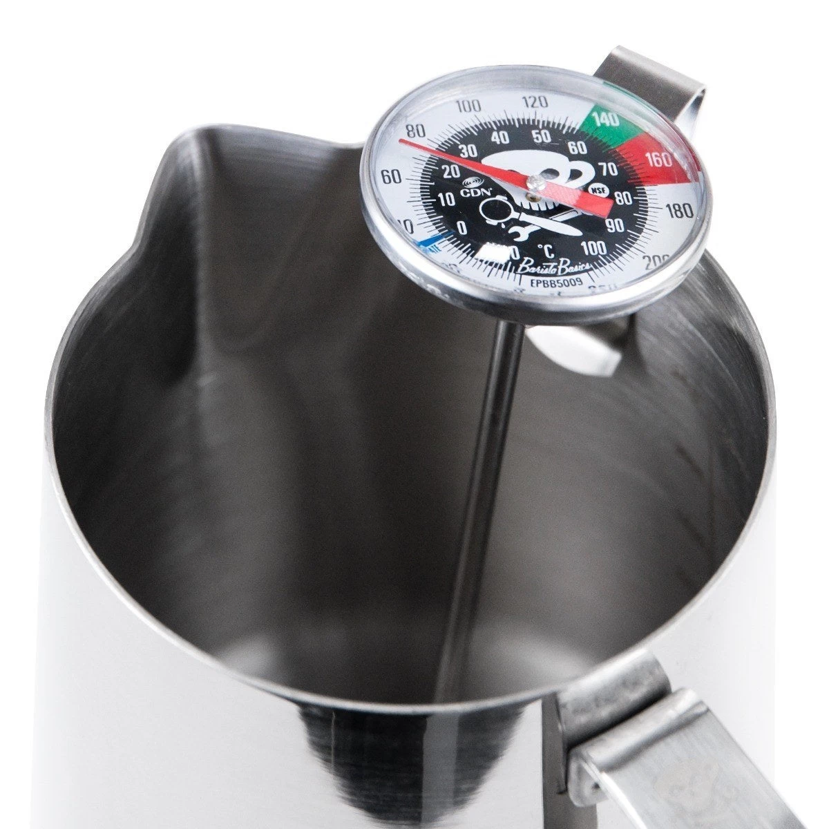 This high-quality milk frothing thermometer simplifies steaming by giving you the means to track the temperature of the milk. Train new baristas to find the perfect temperature or use it to ensure consistent accuracy in your own drinks. This thermometer by Barista Basics is adjustable and can be easily calibrated to ensure long-term precision. Clips onto frothing pitchers for optimal control and perfect for 12 oz. frothing pitchers.