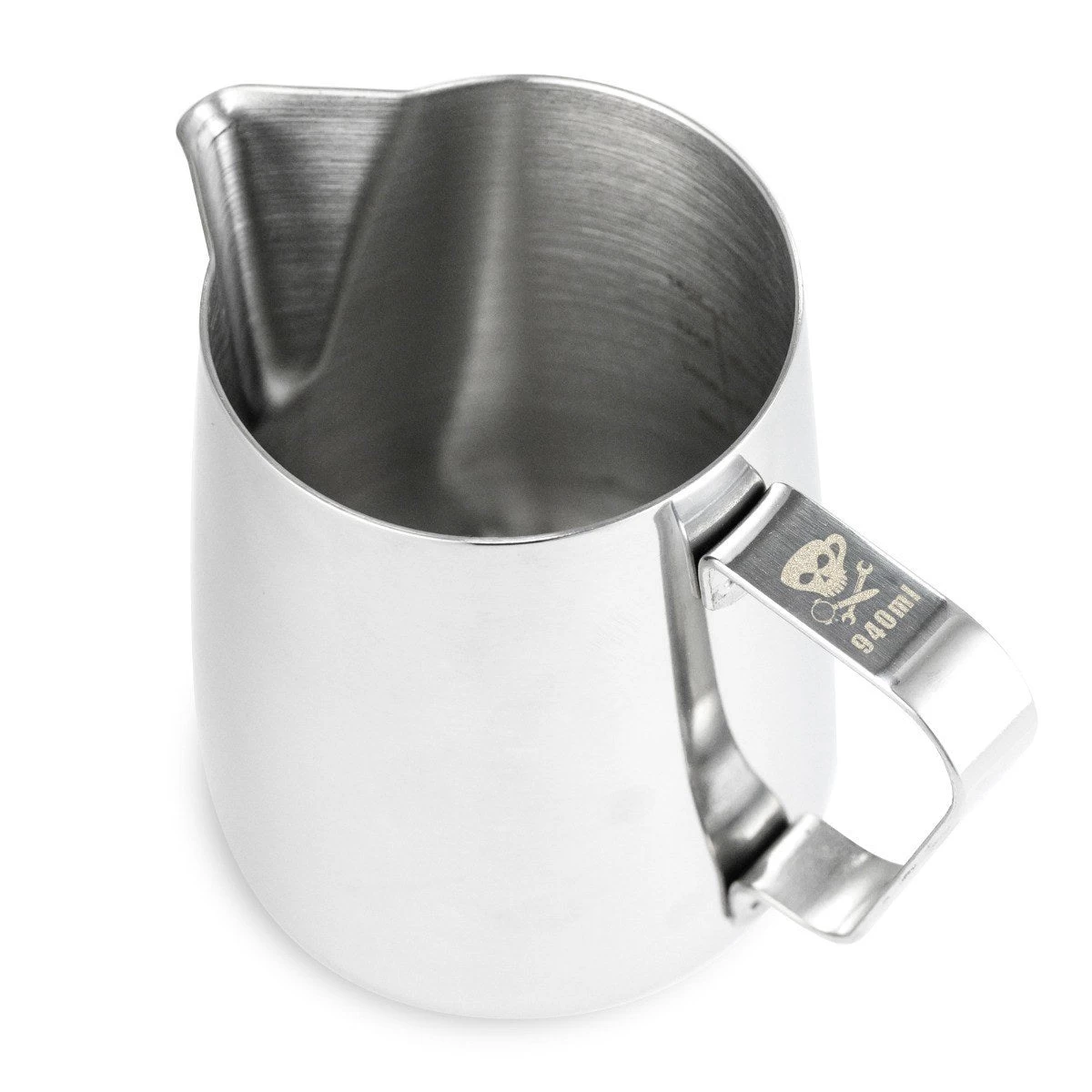 This 32oz steaming pitcher is unmatched in quality and design and is made of 18/8 food-grade stainless steel with a 1.3 mm thickness to ensure milk temperature stability. It features a precision pour spout for latte art and a large handle that is double-reinforced to offer both proper ergonomics and durability. Branded with the Espresso Parts Jolly Roger.