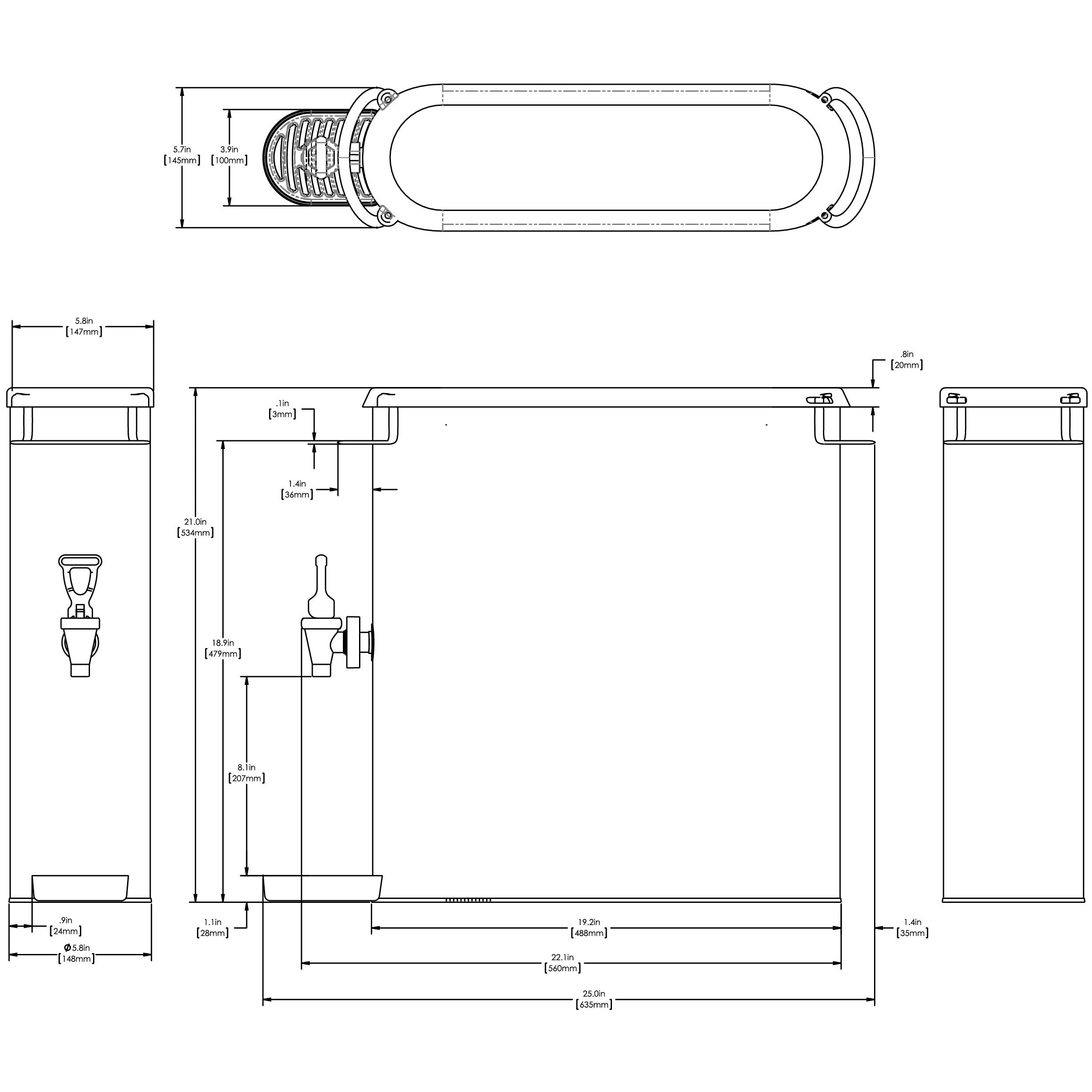 This oval style narrow space-saving iced tea dispenser is designed to hold and serve a 4 gallon batch of iced tea or iced coffee. The integrated drip tray keeps the counter neat and tidy.