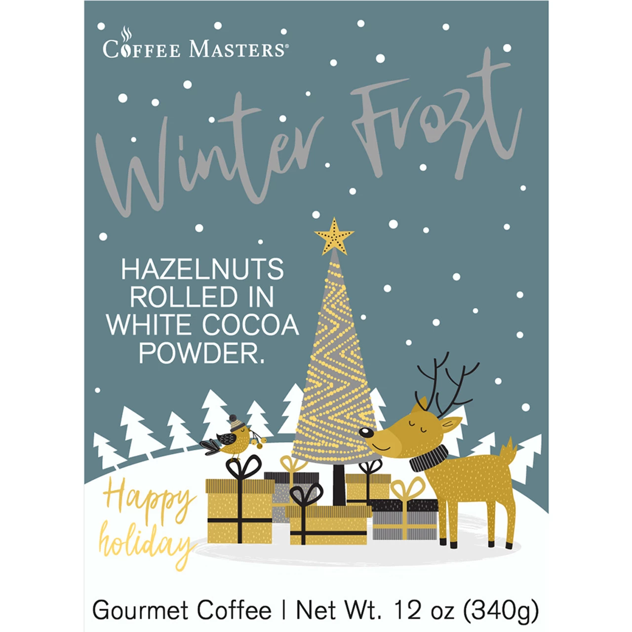 Our Winter Frost flavored coffee all dressed up in a white valve bag with a holiday themed label. Our fresh roasted coffee flavored with the taste of hazelnuts rolled in white cocoa powder. This coffee is dusted with powder which can change nutritional information and cause grinder build up.
