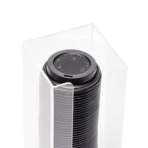 This acrylic coffee lid dispenser is a great way to organize your dispensable drinkware. Holds approximately 50 lids ranging in 10-20 oz sized drinks.