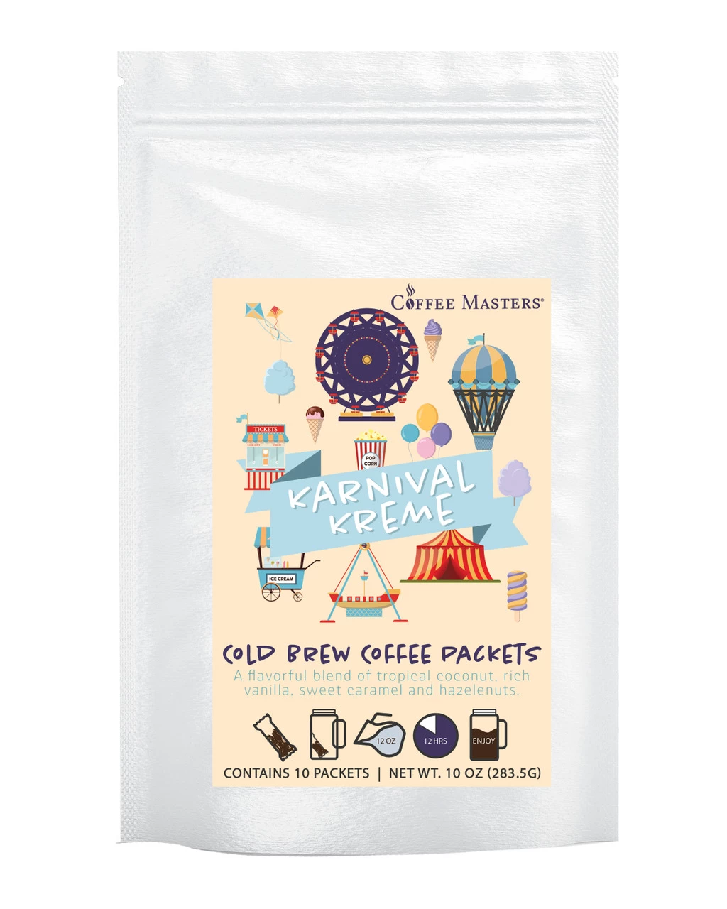 Each case contains 1-10 count bag of the following flavors: Blueberry, Iced Coffee Blend, Karnival Kreme and White Chocolate Raspberry.