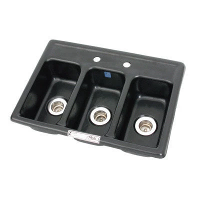 This is most definitely the smallest three-compartment sink we could find! Built of ABS plastic. Includes strainers, but does not include faucet. NSF APPROVED.