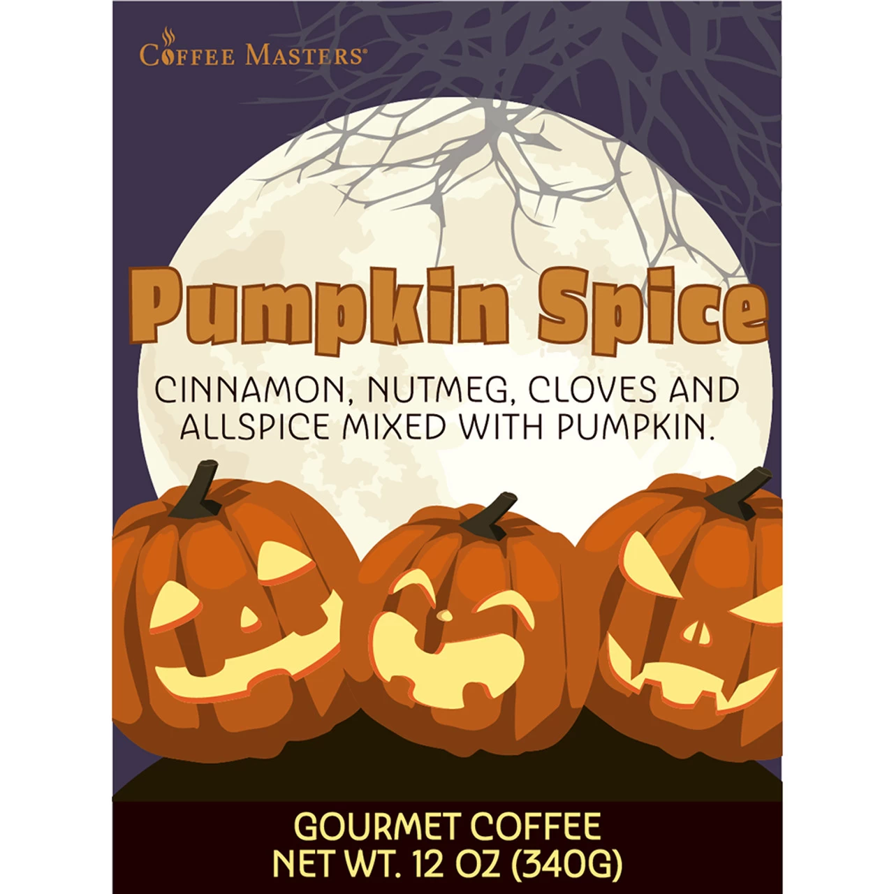 Our Pumpkin Spice flavored coffee displayed in a kraft valve bag with a Jack-o-Lantern design. Our fresh roasted coffee flavored with Pumpkin Spice (Cinnamon, nutmeg, cloves, allspice and pumpkin).