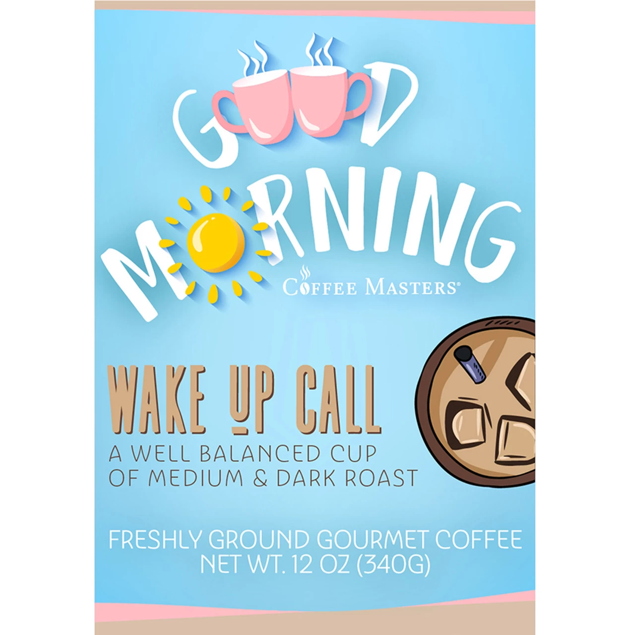 Our popular Wake Up Call BlendĀ unflavored coffeeĀ in a whiteĀ retailĀ bag with a morningĀ themed label. Fresh roasted 100% Arabica coffee. DarkĀ roasted.