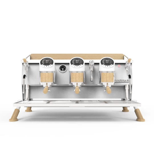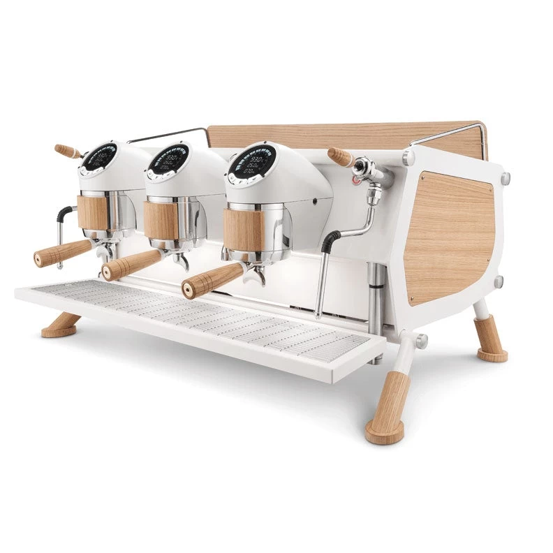 The White & Wood version of the Café Racer Espresso Machine has a simple and clean look that evokes a feeling of naturalness so it’s perfect for any café that specializes in organic coffee or just likes to have a minimalist clean look. The natural oak pairs perfectly with the white dye on this machine and the LED display is further elevated on the digital displays. A very nice option for any café.