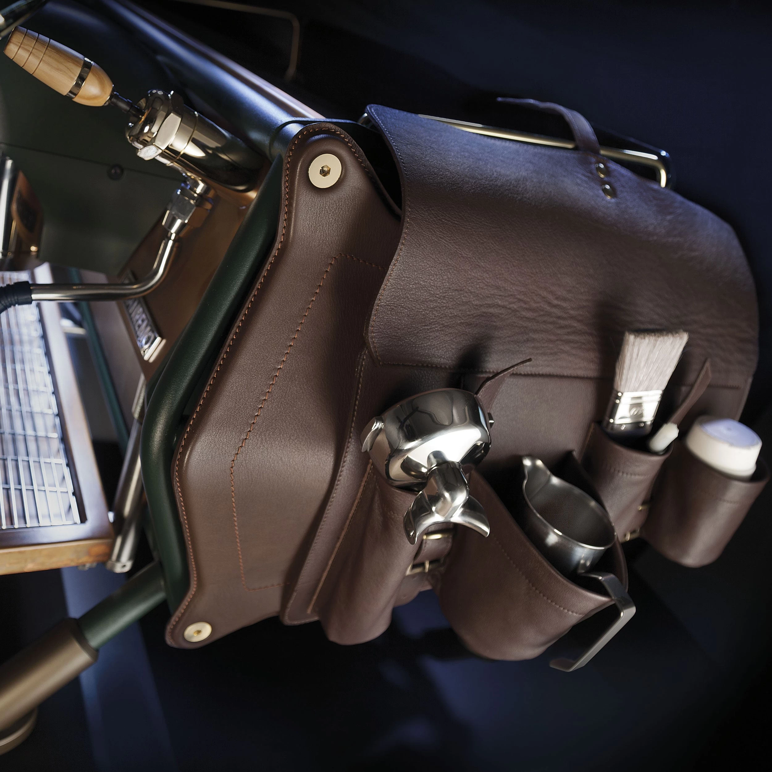 The Café Renegade is the ultimate option in customizing your espresso machine to match the personality of your café. It features handmade finishes in a beautiful organic color palette made of oxidized copper and reddish-brown brass with unique additions such as a hand-sewn leather saddlebag that is fully functional as a place to keep all your barista tools handy. This machine is definitely a statement piece for any café.