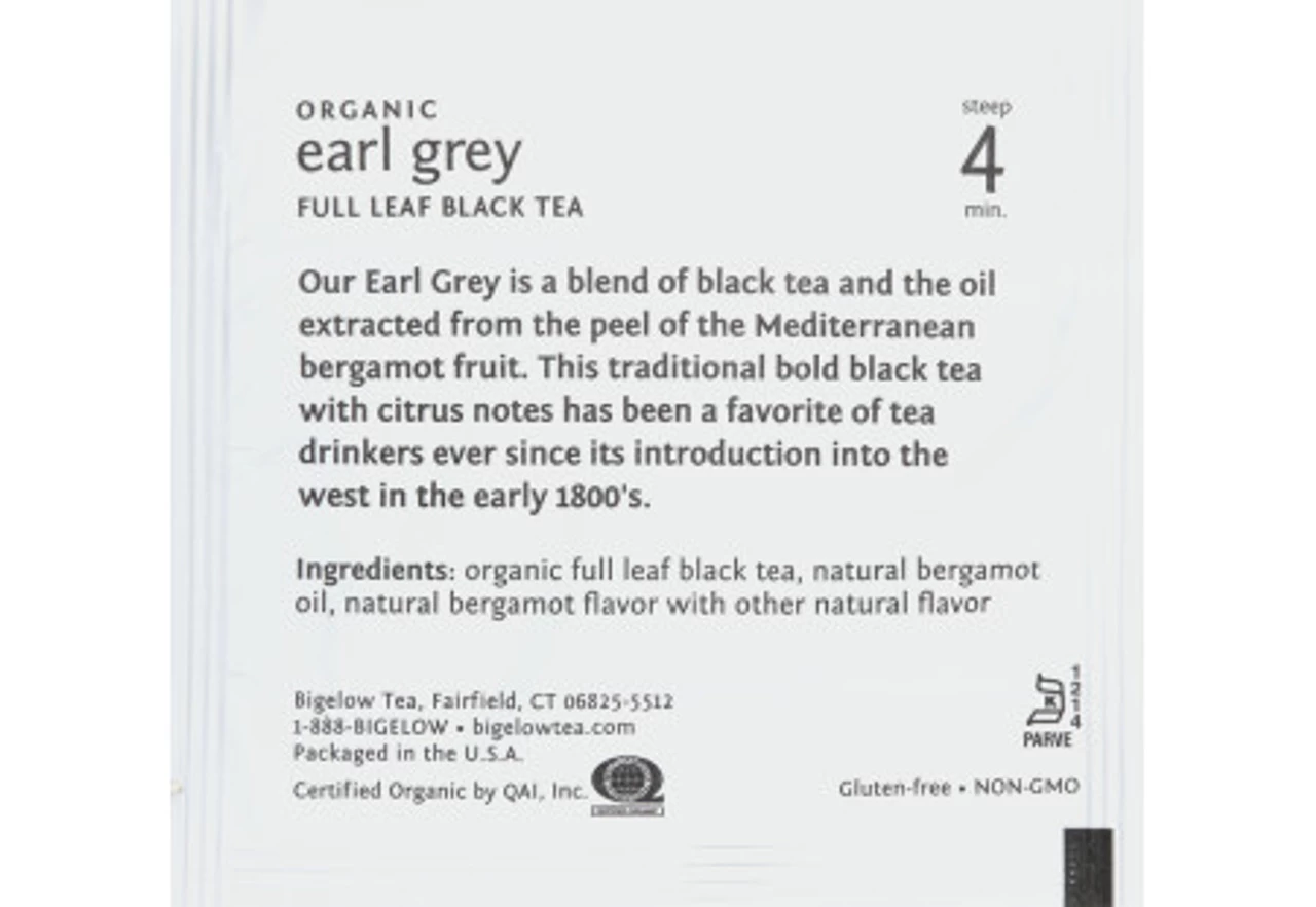 Ingredients: organic full leaf black tea, natural bergamot oil, natural bergamot flavor with other natural flavor